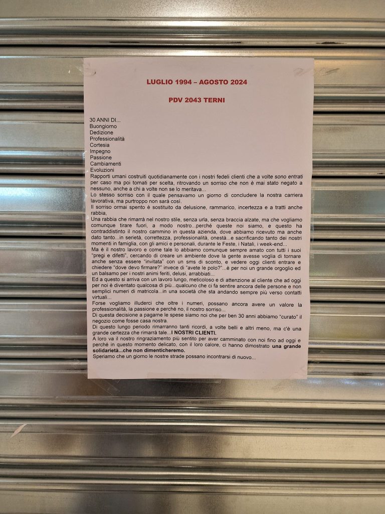 “Rapporti umani costruiti quotidianamente con i nostri fedeli clienti che a volte sono entrati per caso e tornati per scelta, ritrovando un sorriso che non è mai stato negato a nessuno, anche a chi a volte non se lo meritava”, recita. Una rabbia non celata nascosta a rassegnazione e ovviamente a nulla è servita la recente petizione per chiedere di mantenere aperto il negozio. Che ne sarà del personale ora? Intanto per tutte scatta la cassa integrazione. Al termine della quale dovranno valutare le proposte. Bastia Umbra o Viterbo le soluzioni più vicine prospettate.