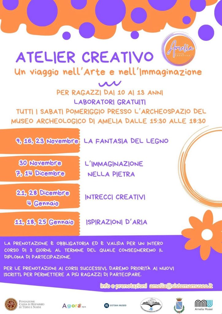 La partecipazione ai laboratori è gratuita ma è richiesta la prenotazione via email all’indirizzo amelia@sistemamuseo.it. Per garantire l’accesso a un numero maggiore di bambini e ragazzi, per le sessioni successive sarà data priorità ai nuovi iscritti.