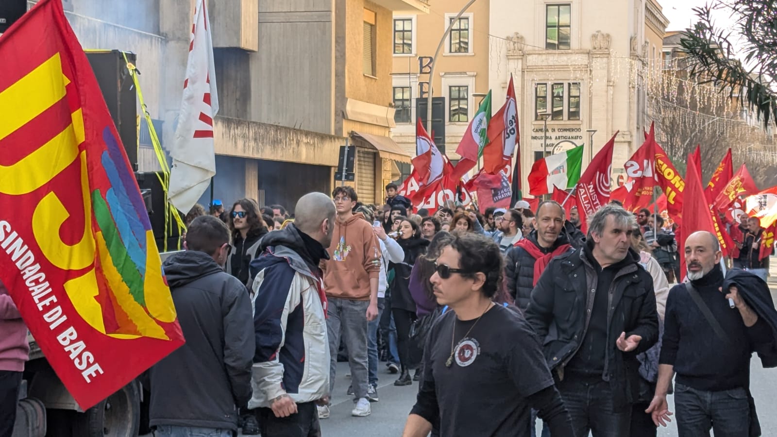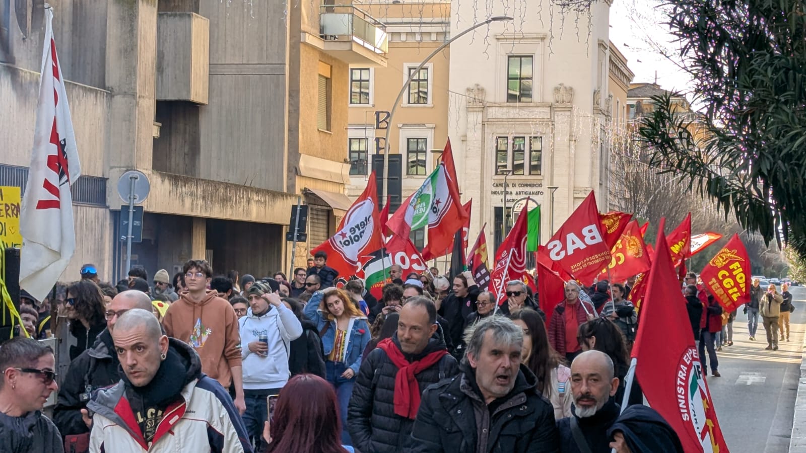 Corteo in piazza delle forze di sinistra (Rifondazione Comunista, Potere al Popolo, Sinistra Italiana,Sinistra Anticapitalista, Movimento 5 Stelle, AVS, Movimento Radicalsocialista) insieme ad Arci, Fiom Cgil, Flc Cgil, Usb, Cobas, Centro sociale Cimarelli, Coordinamento ternano per la Palestina, Agedo, Esedomani Terni, Il Pettirosso, Casa Rossa Spoleto, All Eyes on Palestine e Unione degli Studenti contro il Ddl Sicurezza.