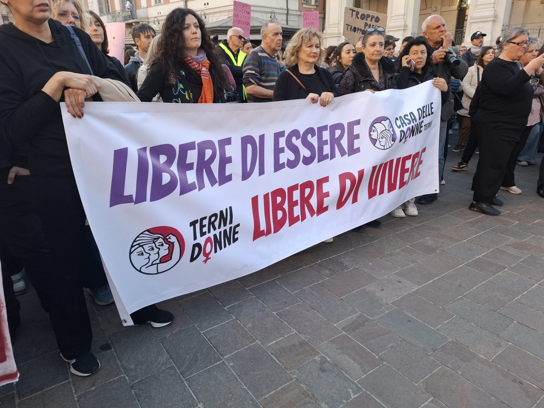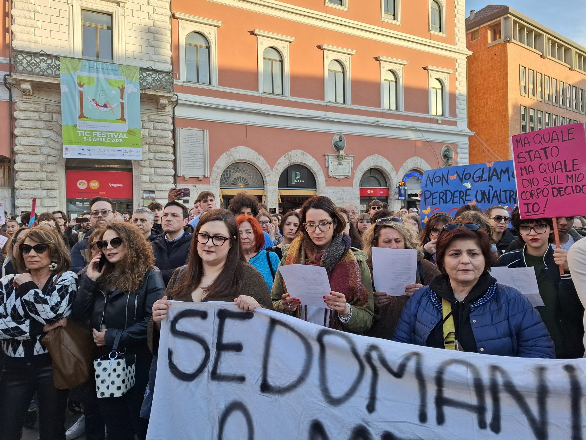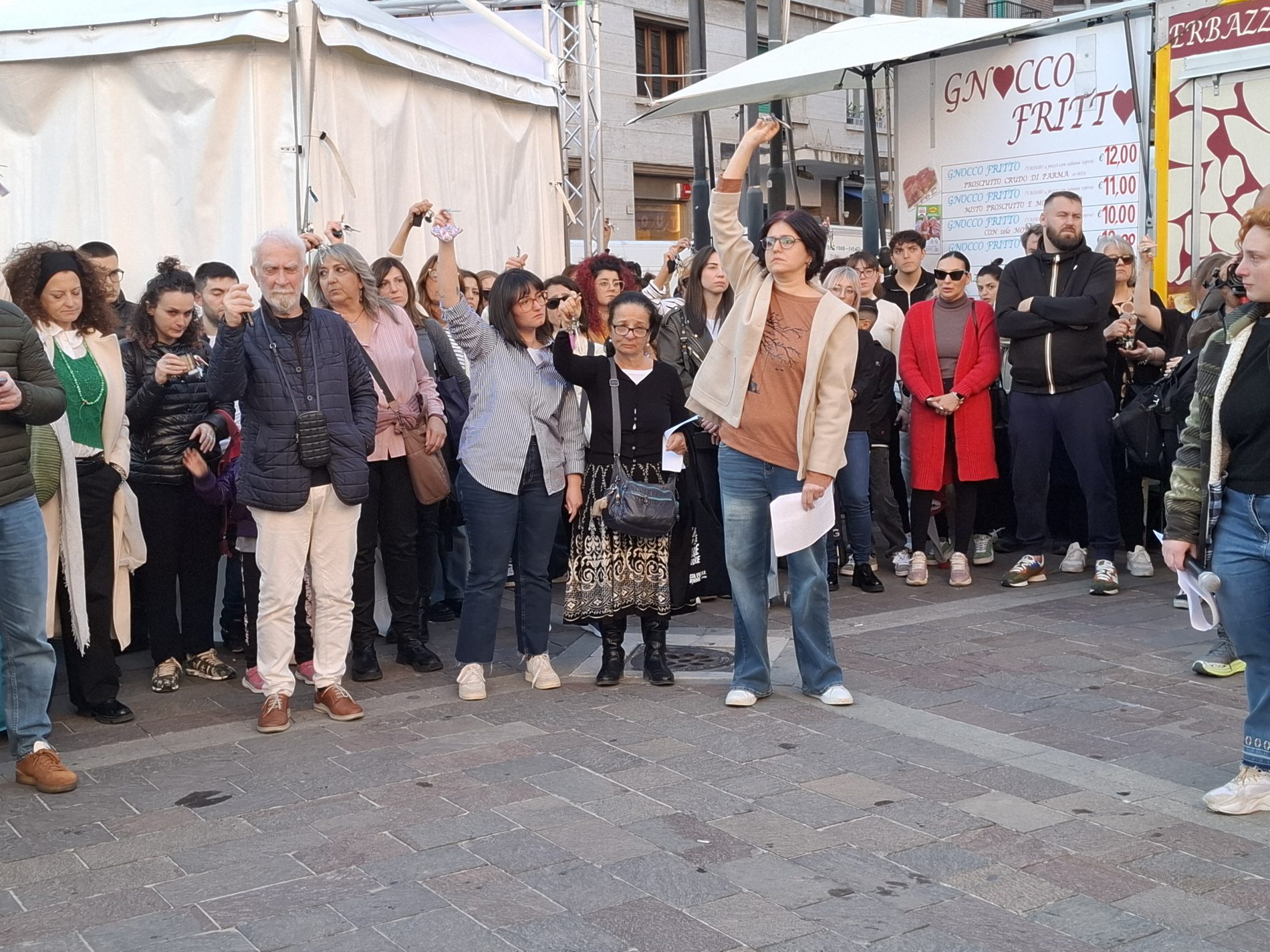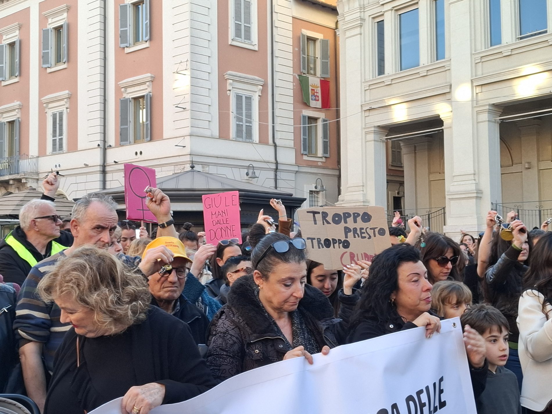 Piazza della Repubblica gremita, tante donne ma anche diversi uomini, compresi diversi esponenti politici. Terni ha risposto all’appello: cori, canti di libertà e femministi, poesie (nel video potete ascoltarne una) e poi il gesto ormai consueto delle chiavi agitate in aria, simbolo di libertà.