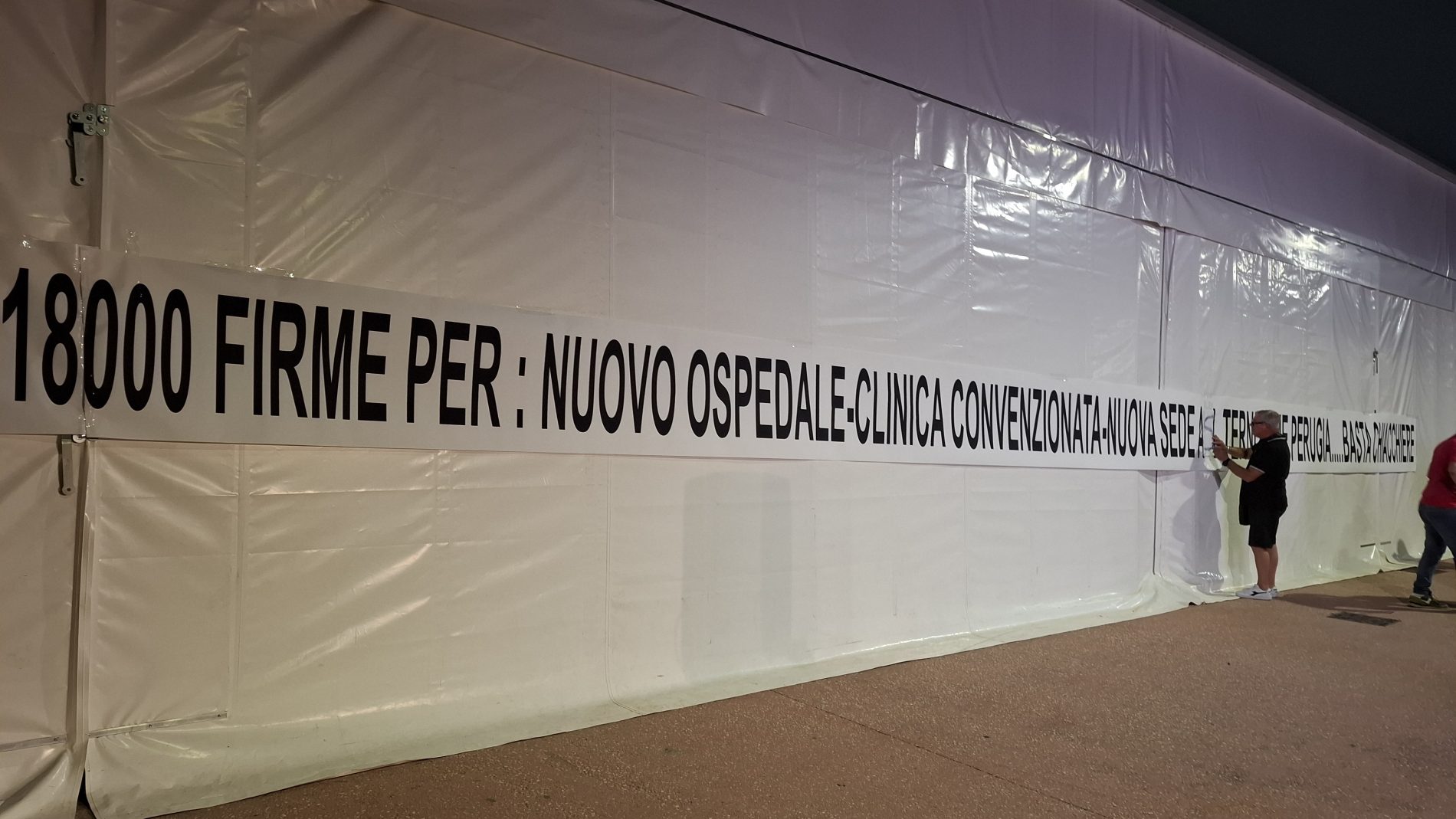 Tema numero 2, quello su cui è incalzata maggiormente è la questione stadio-clinica: i cittadini hanno anche srotolato anche uno striscione che ricorda le 18.000 firme raccolte per il progetto, appendendolo a fianco del palco dove parlava la giunta.
