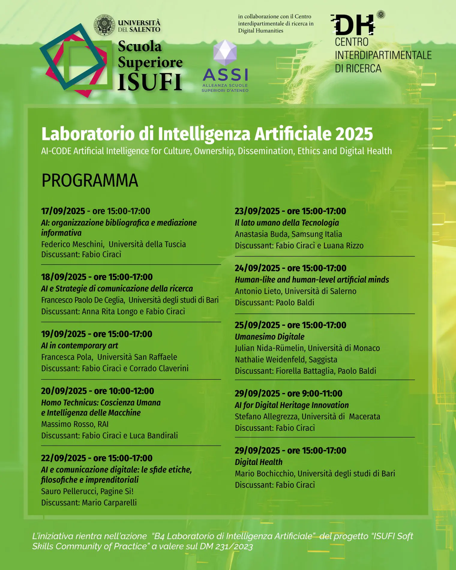 Il suo intervento si inserisce nel Laboratorio di Intelligenza Artificiale 2025, un ciclo di incontri che dal 17 al 29 settembre porterà a Lecce studiosi e professionisti per discutere i rapporti tra tecnologia e scienze umane.