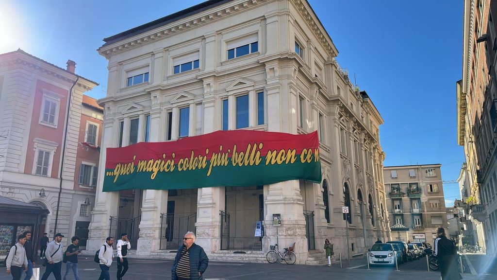 Un grande drappo con i colori della Ternana campeggia sulla facciata: l'omaggio di PagineSì ai 100 anni delle Fere...
