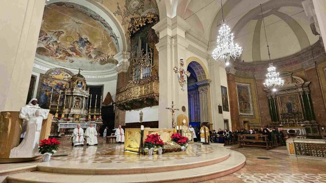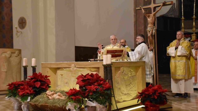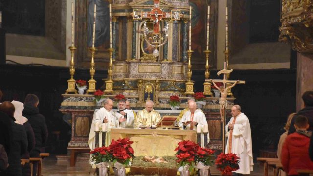 Nella cattedrale di Terni si è svolta la santa messa della Notte di Natale, presieduta dal vescovo Francesco Antonio Soddu. La celebrazione del 24 dicembre ha visto la partecipazione di numerosi fedeli della comunità diocesana, che il presule ha salutato singolarmente al termine della funzione religiosa. Insieme al vescovo hanno concelebrato don Alessandro Rossini, parroco della cattedrale, don Marcello Giorgi e don Francesco De Santis.