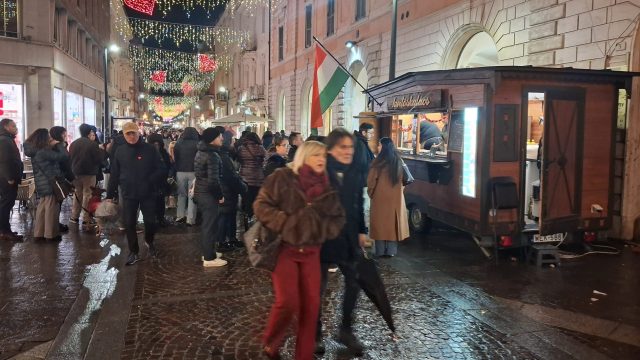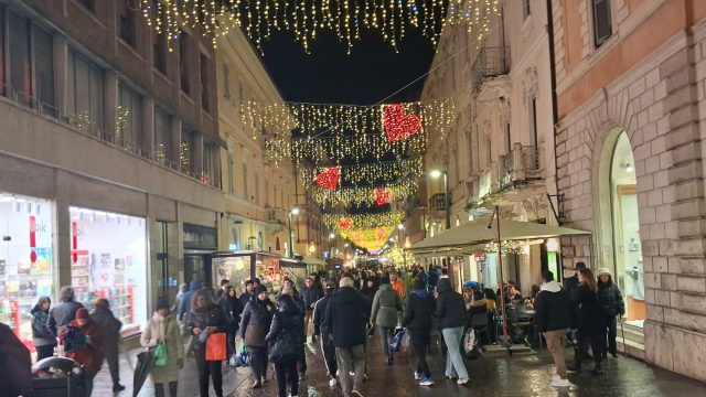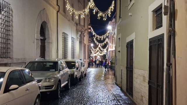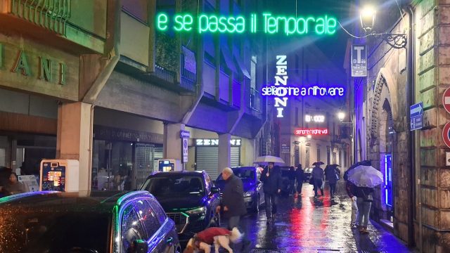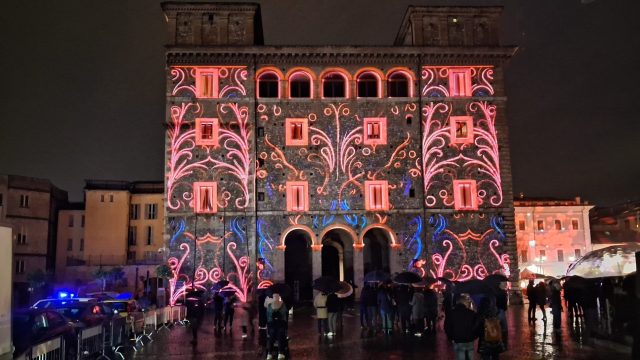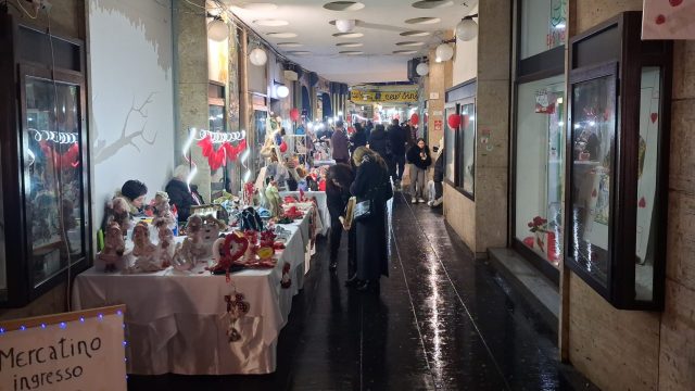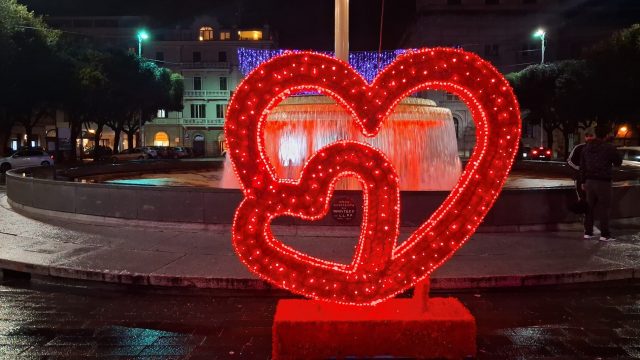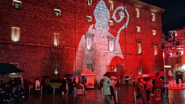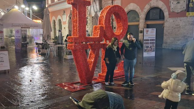 Pioggia a intermittenza, nel pomeriggio del 14 febbraio, su Terni. Quanto è bastato, però, per disturbare le passeggiate in città tra le vie addobbate e illuminate a festa. Terni ha vissuto nonostante le condizioni inclementi del tempo la sua festa, la festa del suo Santo Patrono Valentino. In onore del Santo dell’amore, città addobbata, luminarie e, nel centro cittadino, gli stands di Cioccolentino, la rassegna dedicata ai dolci, alla cioccolata e alle degustazioni che caratterizza il fine settimana fino al 15 febbraio. Lungo le vie, tanti si fermano ad ammirare le luci, a scoprire ciò che le bancarelle propongono e anche a fotografarsi sugli appositi totem, piazzati in diversi punti della città, con i cuori e con sfondi dedicati all’amore. Set di selfie per innamorati, ma anche per genitori con i loro figli. Tra le attrazioni di questa edizione, anche le proiezioni e i videomapping sulle pareti di palazzo Spada, tra luci, immagini e anche la storia di Sabino e Serapia, i due innamorati che proprio Valentino unì in matrimonio dopo che lei, cristiana, convinse il suo amato , pagano, a farsi battezzare. Le manifestazioni per la festa patronale proseguono anche nella giornata di domenica 15 febbraio, con diversi eventi tra i quali il Pontificale in Cattedrale presieduto dal vescovo monsignor Francesco Antonio Soddu la mattina e, nel pomeriggio, la processione per riportare l’urna con le reliquie del Santo dal Duomo alla Basilica accompagnata dal corteo in costume.