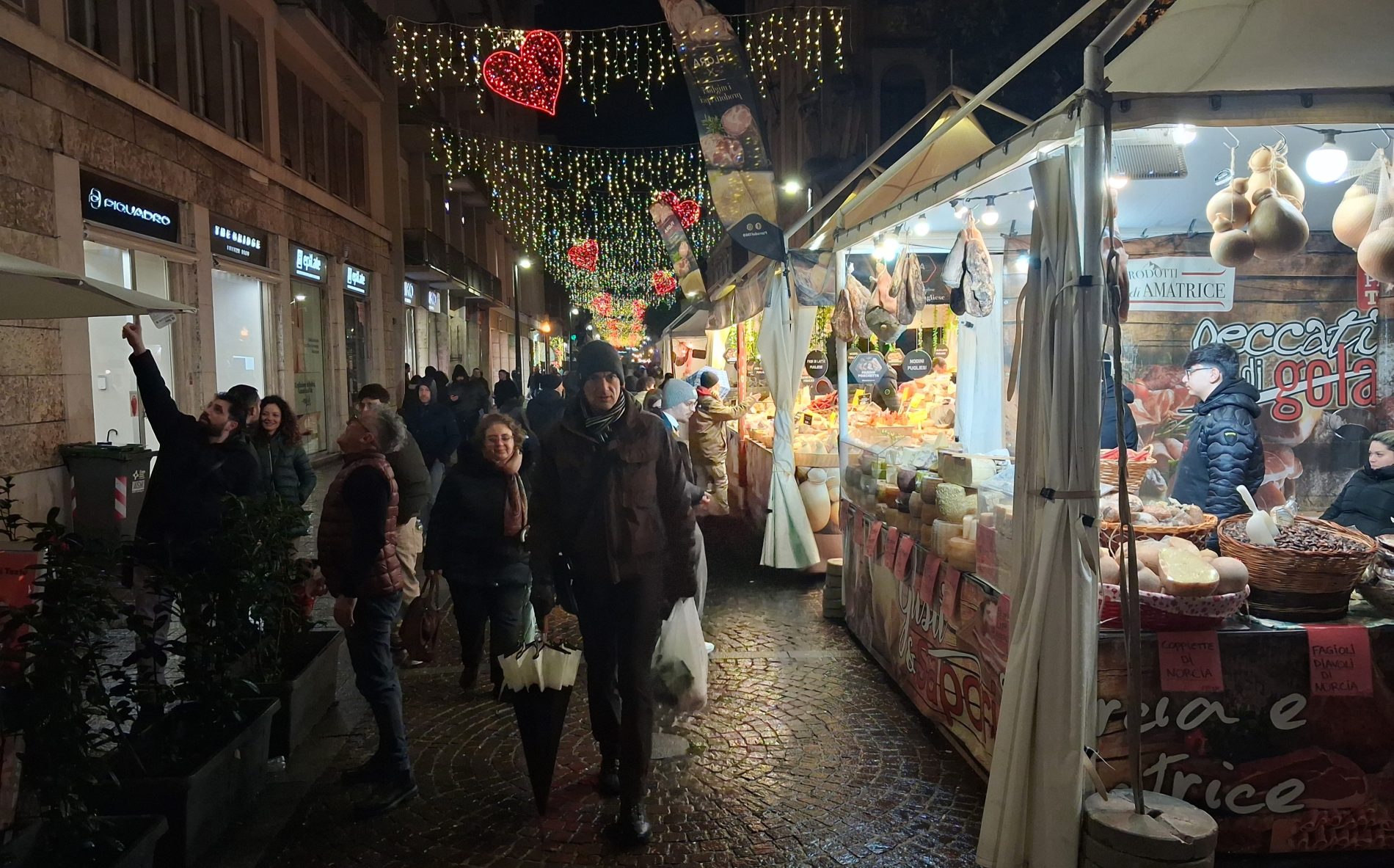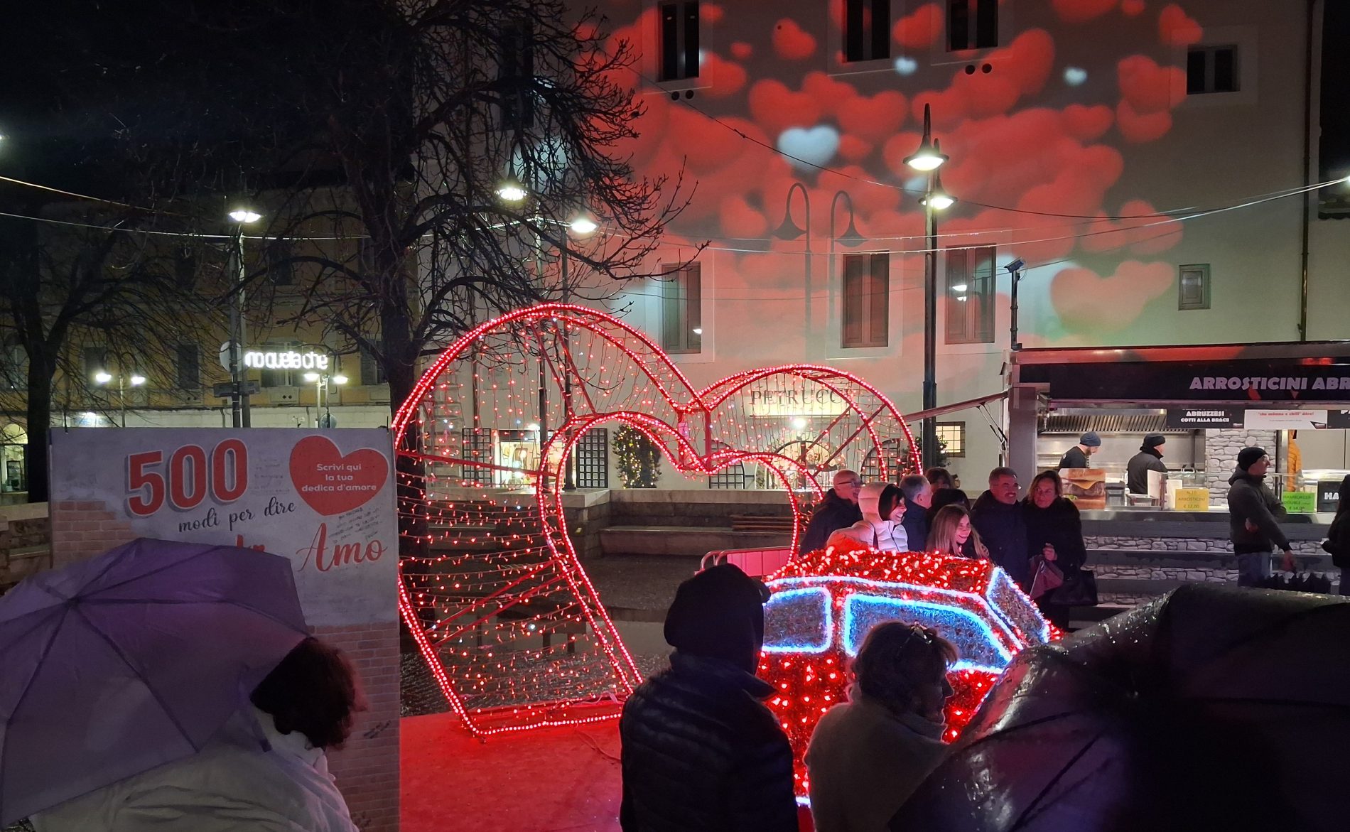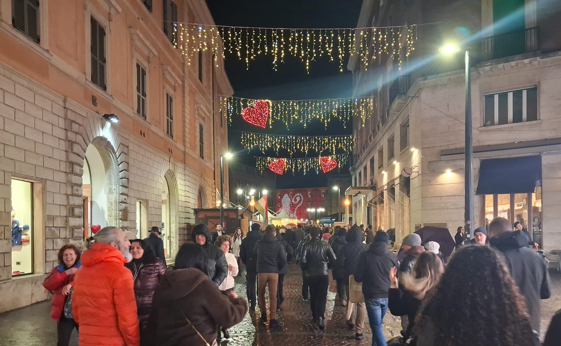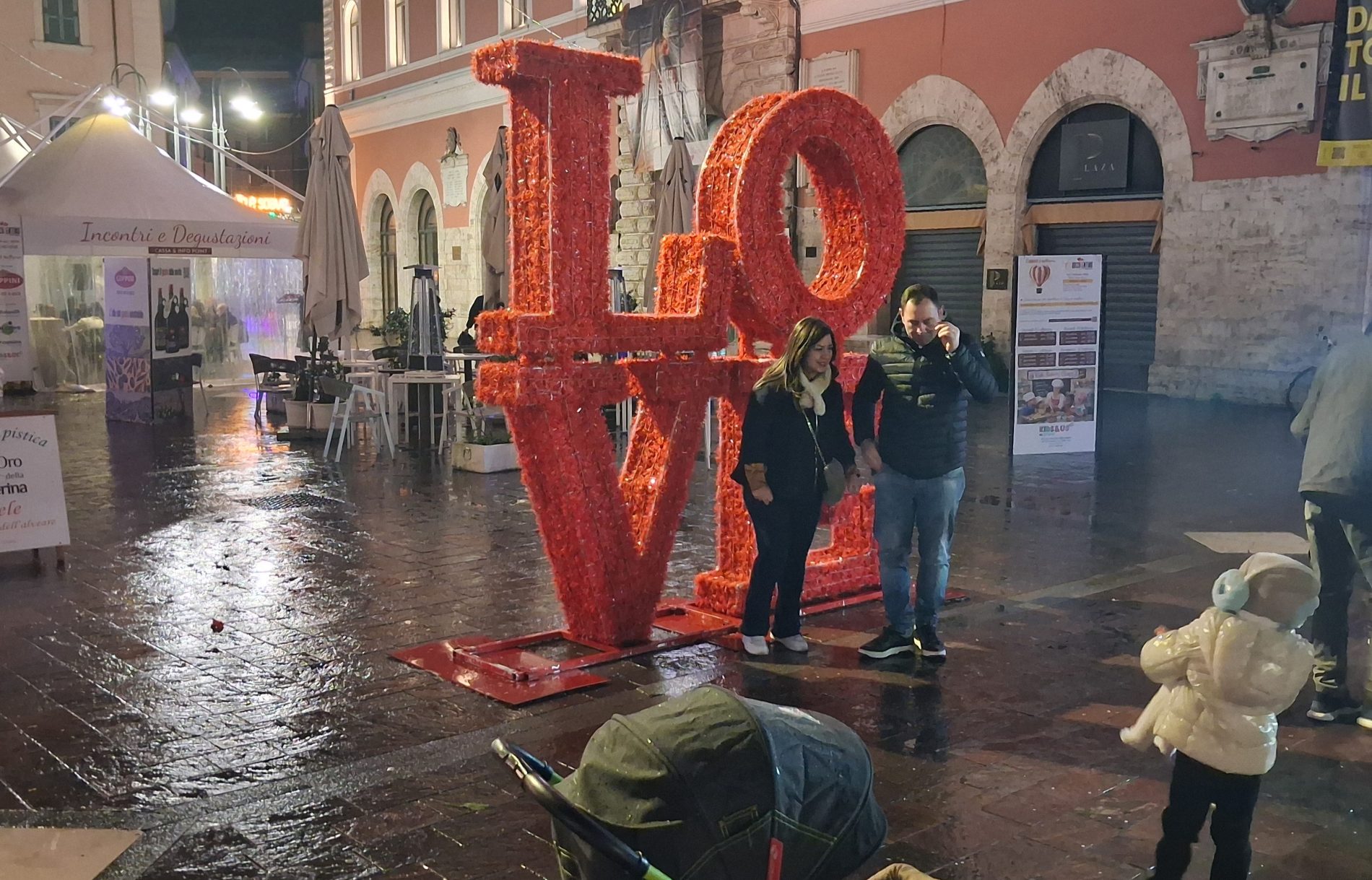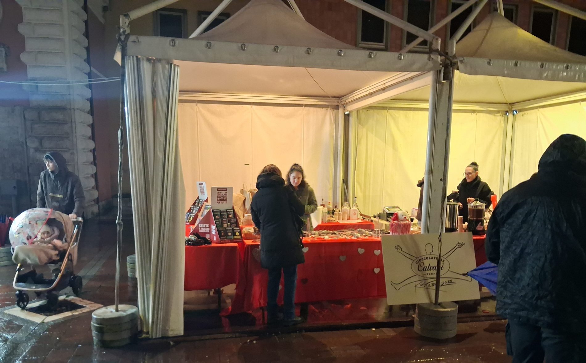 Pioggia a intermittenza, nel pomeriggio del 14 febbraio, su Terni. Quanto è bastato, però, per disturbare le passeggiate in città tra le vie addobbate e illuminate a festa. Terni ha vissuto nonostante le condizioni inclementi del tempo la sua festa, la festa del suo Santo Patrono Valentino. In onore del Santo dell’amore, città addobbata, luminarie e, nel centro cittadino, gli stands di Cioccolentino, la rassegna dedicata ai dolci, alla cioccolata e alle degustazioni che caratterizza il fine settimana fino al 15 febbraio. Lungo le vie, tanti si fermano ad ammirare le luci, a scoprire ciò che le bancarelle propongono e anche a fotografarsi sugli appositi totem, piazzati in diversi punti della città, con i cuori e con sfondi dedicati all’amore. Set di selfie per innamorati, ma anche per genitori con i loro figli. Tra le attrazioni di questa edizione, anche le proiezioni e i videomapping sulle pareti di palazzo Spada, tra luci, immagini e anche la storia di Sabino e Serapia, i due innamorati che proprio Valentino unì in matrimonio dopo che lei, cristiana, convinse il suo amato , pagano, a farsi battezzare. Le manifestazioni per la festa patronale proseguono anche nella giornata di domenica 15 febbraio, con diversi eventi tra i quali il Pontificale in Cattedrale presieduto dal vescovo monsignor Francesco Antonio Soddu la mattina e, nel pomeriggio, la processione per riportare l’urna con le reliquie del Santo dal Duomo alla Basilica accompagnata dal corteo in costume.