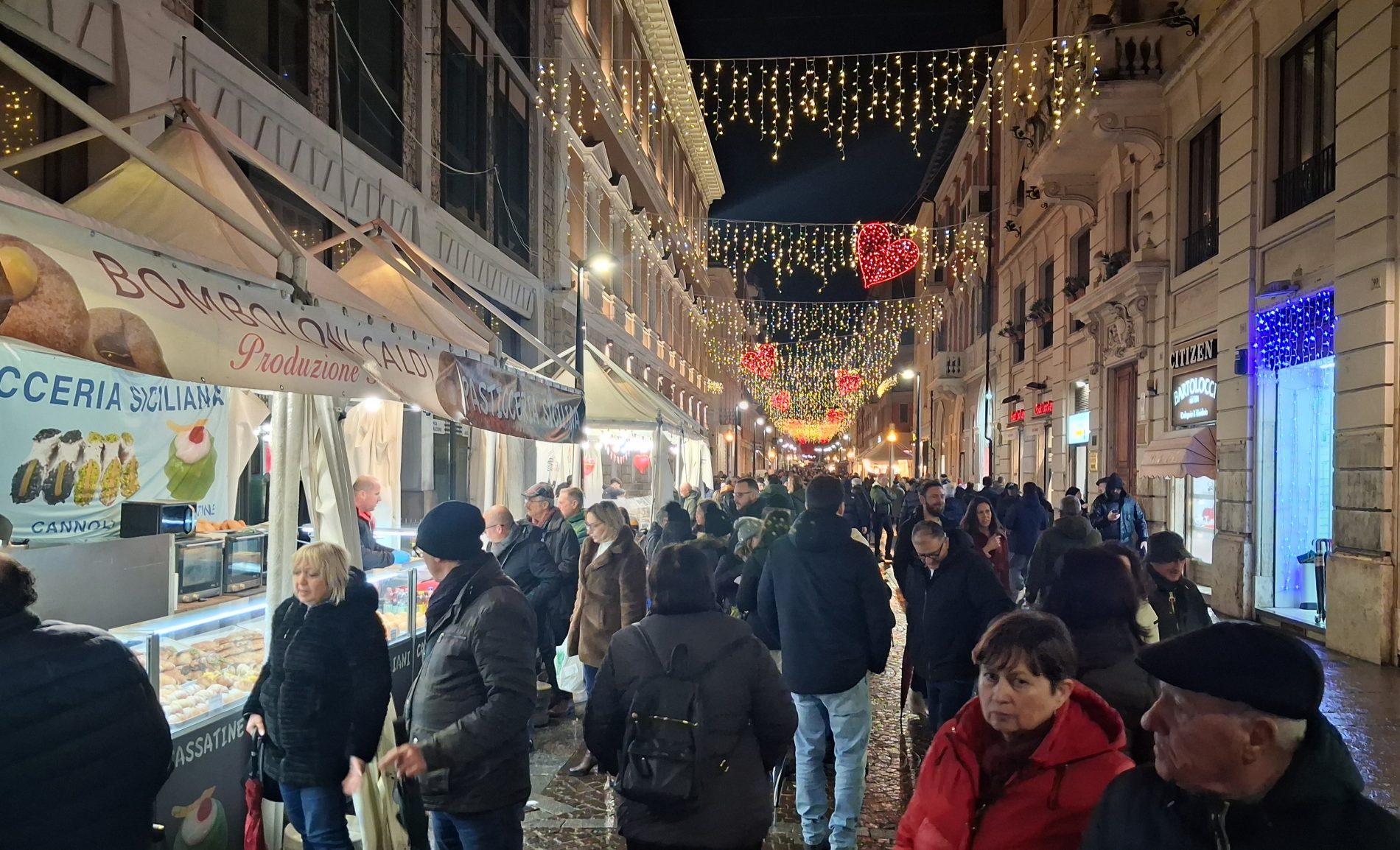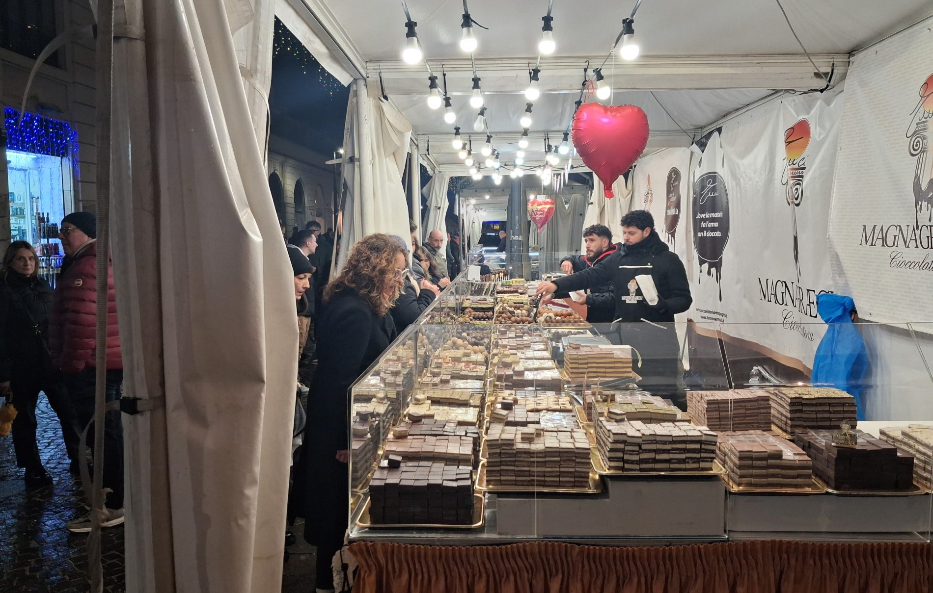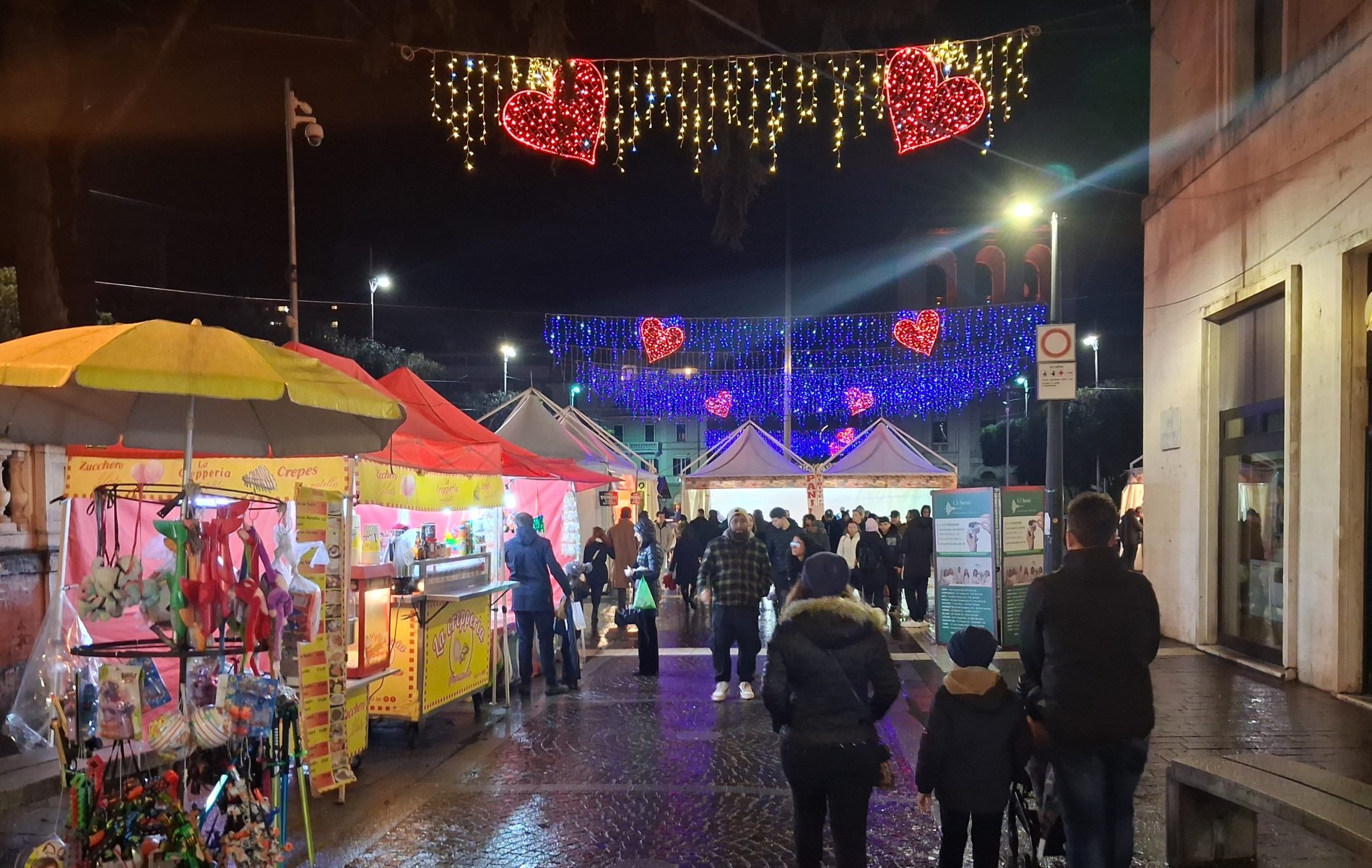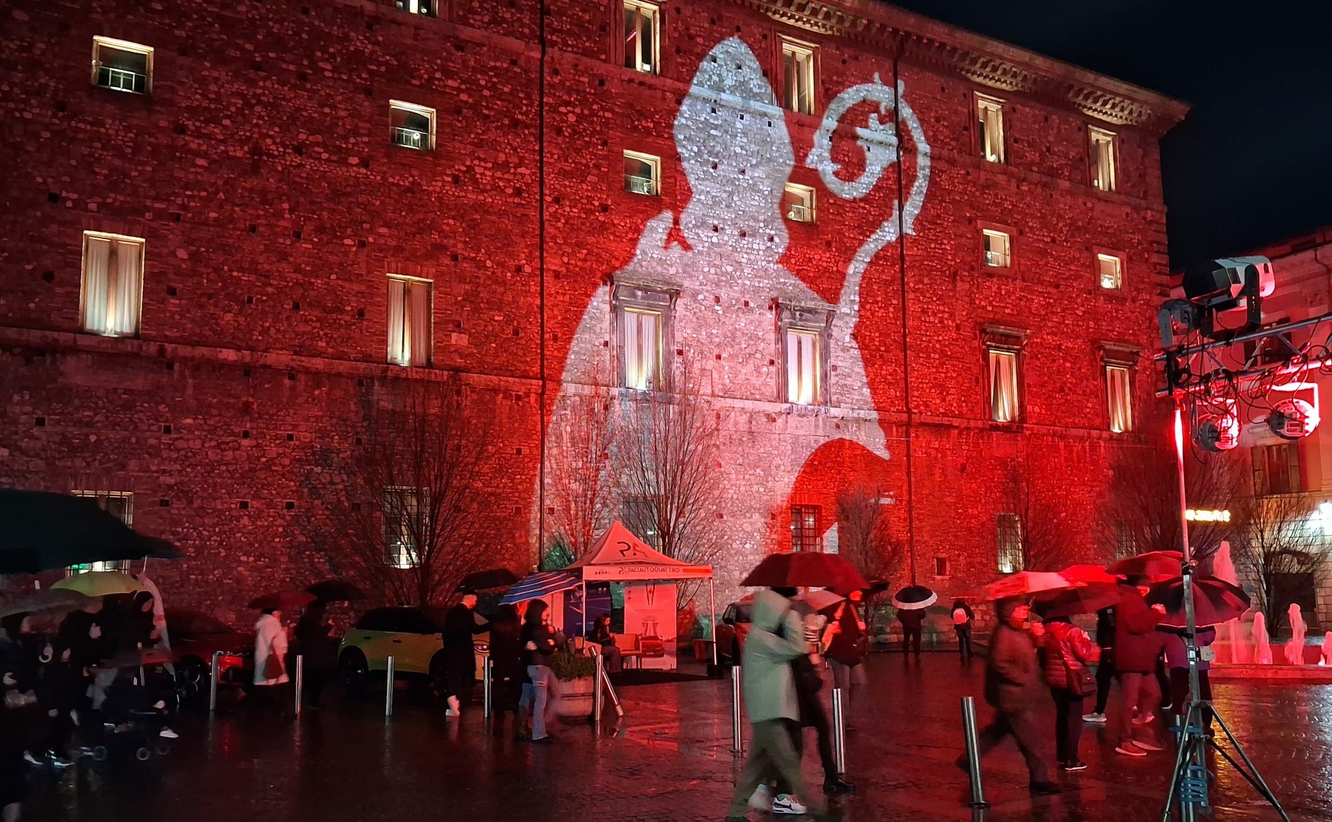 Pioggia a intermittenza, nel pomeriggio del 14 febbraio, su Terni. Quanto è bastato, però, per disturbare le passeggiate in città tra le vie addobbate e illuminate a festa. Terni ha vissuto nonostante le condizioni inclementi del tempo la sua festa, la festa del suo Santo Patrono Valentino. In onore del Santo dell’amore, città addobbata, luminarie e, nel centro cittadino, gli stands di Cioccolentino, la rassegna dedicata ai dolci, alla cioccolata e alle degustazioni che caratterizza il fine settimana fino al 15 febbraio. Lungo le vie, tanti si fermano ad ammirare le luci, a scoprire ciò che le bancarelle propongono e anche a fotografarsi sugli appositi totem, piazzati in diversi punti della città, con i cuori e con sfondi dedicati all’amore. Set di selfie per innamorati, ma anche per genitori con i loro figli. Tra le attrazioni di questa edizione, anche le proiezioni e i videomapping sulle pareti di palazzo Spada, tra luci, immagini e anche la storia di Sabino e Serapia, i due innamorati che proprio Valentino unì in matrimonio dopo che lei, cristiana, convinse il suo amato , pagano, a farsi battezzare. Le manifestazioni per la festa patronale proseguono anche nella giornata di domenica 15 febbraio, con diversi eventi tra i quali il Pontificale in Cattedrale presieduto dal vescovo monsignor Francesco Antonio Soddu la mattina e, nel pomeriggio, la processione per riportare l’urna con le reliquie del Santo dal Duomo alla Basilica accompagnata dal corteo in costume.